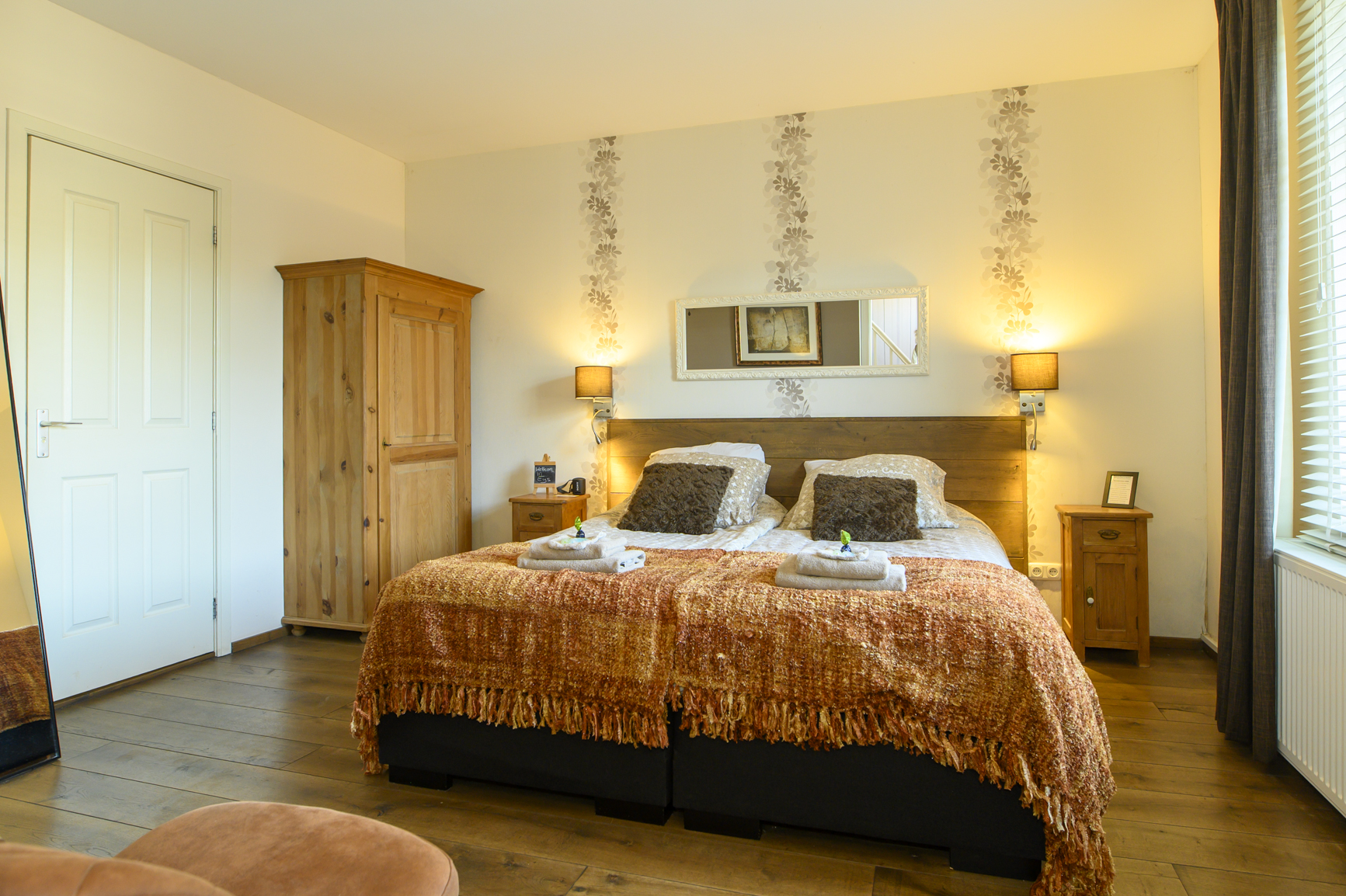 De B&B biedt plaats aan maximaal 9 personen in 3 luxe 2-persoonskamers met badkamer en 1 luxe 3-persoonskamer met badkamer. Uiteraard behoren voldoende handdoeken en doucheartikelen tot de standaarduitrusting van de kamers, daarnaast heeft ook iedere kamer een Nespresso-apparaat met cups, een waterkoker met thee en een draadloze bluetooth speaker.